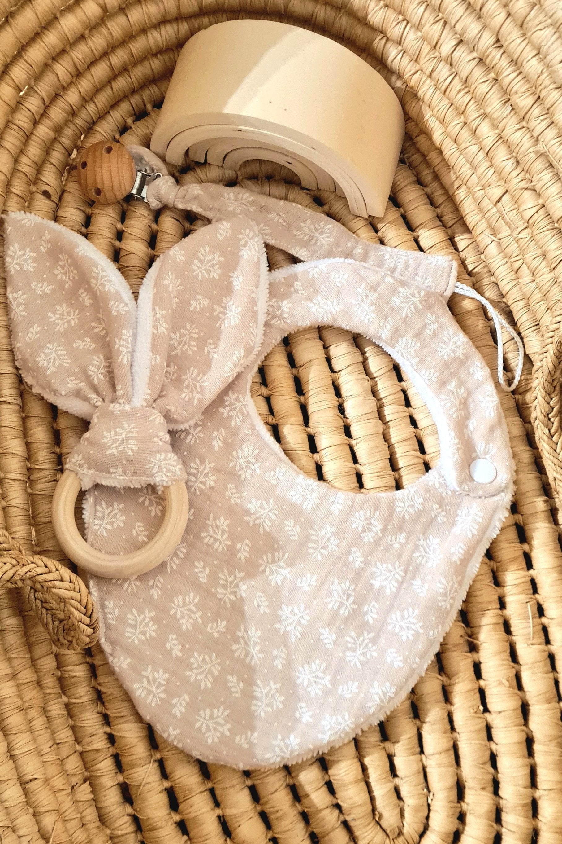 Faites plaisir aux jeunes parents avec ce coffret naissance élégant et pratique, comprenant un bavoir en éponge douce, un attache-tétine personnalisé et un anneau de dentition lapin. Chaque élément est confectionné avec soin dans un tissu imprimé au choix, pour un cadeau à la fois utile et unique.